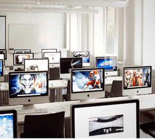 Our campus is equipped with updated iMacs with high-end design software, photo studios, VR equipment, green screen rooms, sound studios, graphic tabs, game labs, SR cameras and more.